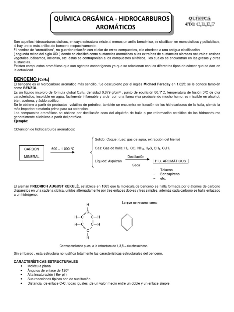 El benceno es el hidrocarburo aromático más sencillo, fue descubierto por el inglés Michael Faraday en 1,825; se le conoce también
