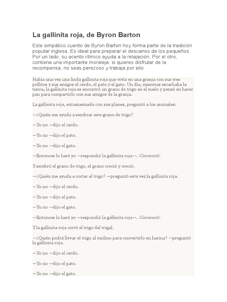 —Entonces lo haré yo —respondió la gallinita roja—. ¡Cocorocó!