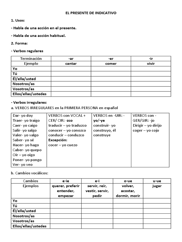 I. Completa las siguientes conjugaciones de los verbos en presente de indicativo: