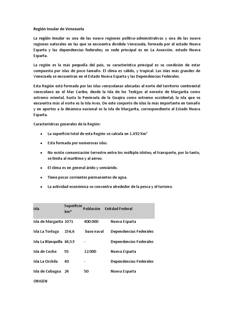 Las Islas o Región Insular, corresponden al estado Nueva Esparta y a las Dependencias