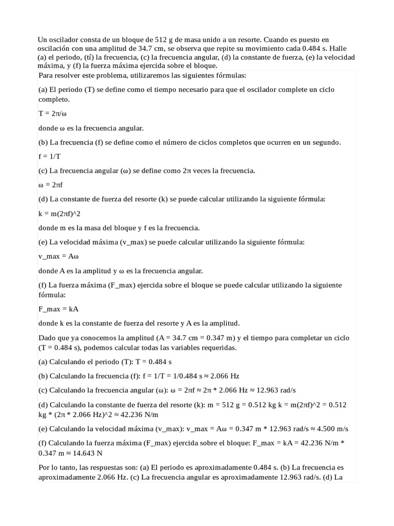 oscilación con una amplitud de 34.7 cm, se observa que repite su movimiento cada 0.484 s. Halle