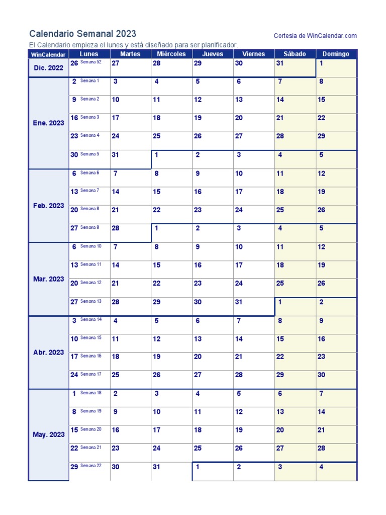 Calendario Semanal 2023 Cortesia de WinCalendar.