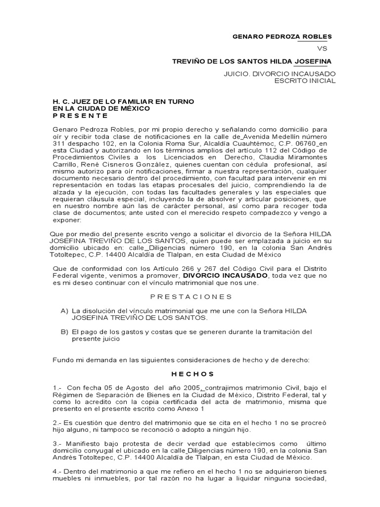 Que por medio del presente escrito vengo a solicitar el divorcio de la Señora HILDA