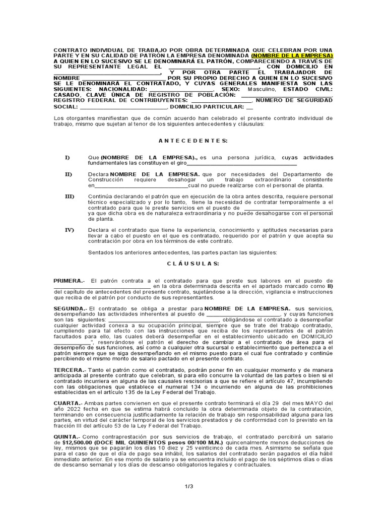 CONTRATO INDIVIDUAL DE TRABAJO POR OBRA DETERMINADA QUE CELEBRAN POR UNA