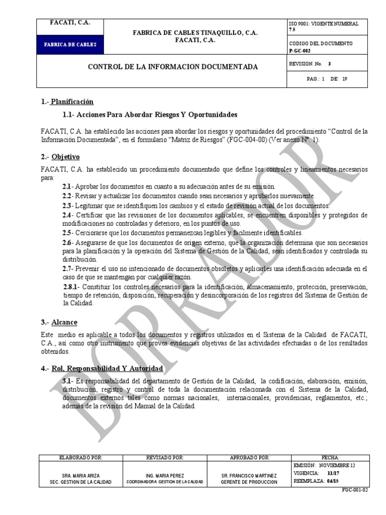 FACATI, C.A. ha establecido un procedimiento documentado que define los controles y lineamientos necesarios