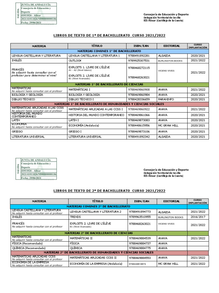 LIBROS DE TEXTO DE 1º DE BACHILLERATO CURSO 2021/2022