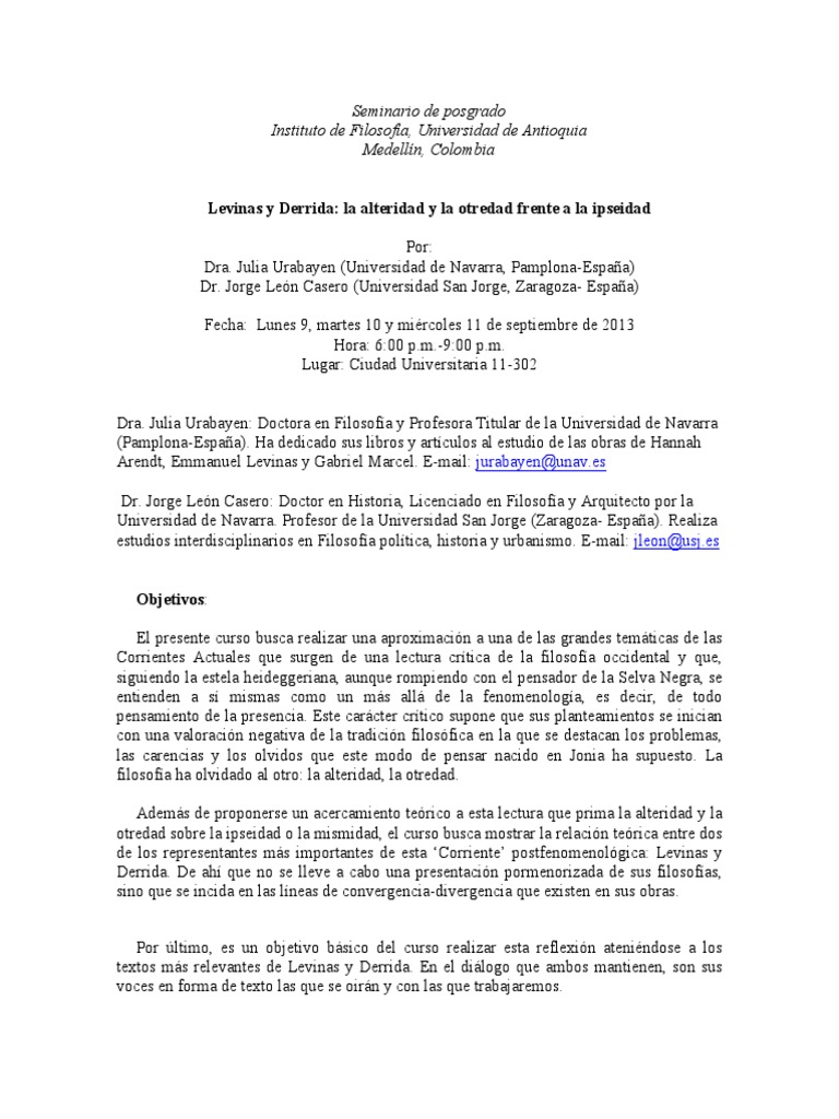 otredad sobre la ipseidad o la mismidad, el curso busca mostrar la relación teórica entre dos