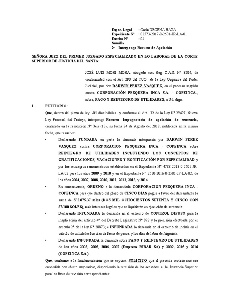 Ley Procesal del Trabajo, interpongo Recurso Impugnatorio de apelación de sentencia,