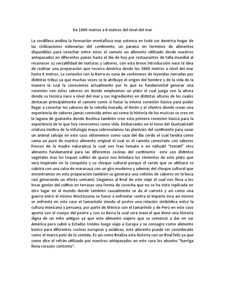 donde su técnica nace a nivel del mar y sus ingredientes en distintas alturas de los cuales