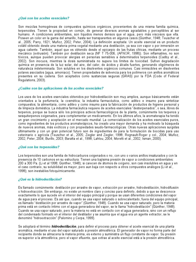 al., 2005; Parry, 1921; Muñoz, 2002; Peter, 2004). La definición aceptada: Un aceite esencial es un producto