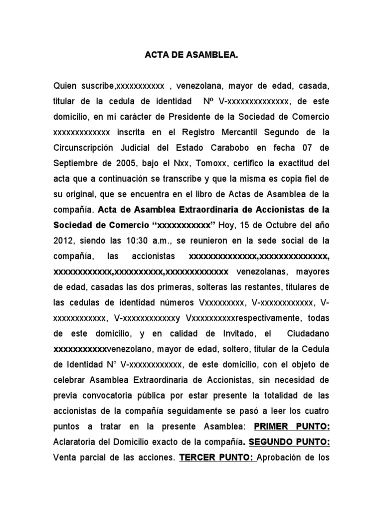 compañía. Acta de Asamblea Extraordinaria de Accionistas de la