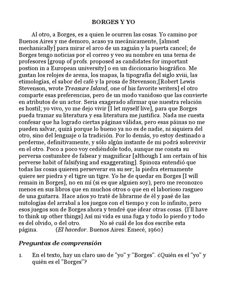 Yo camino por Buenos Aires y me demoro, acaso ya mecnicamente, [almost mechanically] para mirar el arco de un zagun y la puerta cancel; de Borges tengo noticias por el correo y veo su nombre en una terna de profesores [group of profs. proposed as candidates for important postion in a European university] o en un diccionario biogrfico. Me gustan los relojes de arena, los mapas, la tipografa del siglo xviii, las etimologas, el sabor del caf y la prosa de Stevenson;[Robert Lewis Stevenson, wrote Treasure Island, one of his favorite writers] el otro comparte esas preferencias, pero de un modo vanidoso que las convierte en atributos de un actor. Seria exagerado afirmar que nuestra relacin es hostil; yo vivo, yo me dejo vivir [I let myself live], para que Borges pueda tramar su literatura y esa literatura me justifica. Nada me cuesta confesar que ha logrado ciertas pginas vlidas, pero esas pinas no me pueden salvar, quiz porque lo bueno ya no es de nadie, ni siquiera del otro, sino del lenguaje o la tradicin. Por lo dems, yo estoy destinado a perderme, definitivamente, y slo algn instante de mi podr sobrevivir en el otro. Poco a poco voy cedindole todo, aunque me consta su perversa costumbre de falsear y magnificar [although I am certain of his perverse habit of falsifying and exaggerating]. Spinoza entendi que todas las cosas quieren perseverar en su ser; la piedra eternamente quiere ser piedra y el tigre un tigre. Yo he de quedar en Borges [I will remain in Borges], no en m (si es que alguien soy), pero me reconozco menos en sus libros que en muchos otros o que en el laborioso rasgueo de una guitarra. Hace aos yo trat de librarme de l y pas de las mitologas del arrabal a los juegos con el tiempo y con lo infinito, pero esos juegos son de Borges ahora y tendr que idear otras cosas. {Ill have to think up other things] As mi vida es una fuga y todo lo pierdo y todo es del olvido, o del otro. No s cul de los dos escribe esta pgina. (El hacedor. Buenos Aires: Emec, 1960) Preguntas de comprensin 1. En el texto, hay un claro uso de "yo" y "Borges". Quin es el "yo" y quin es el "Borges"?