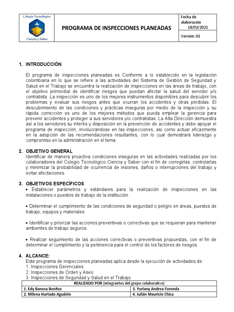 Para el programa de inspecciones planeadas del Colegio Tecnológico Ciencia y Saber, es