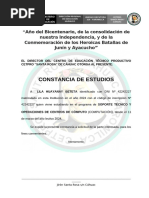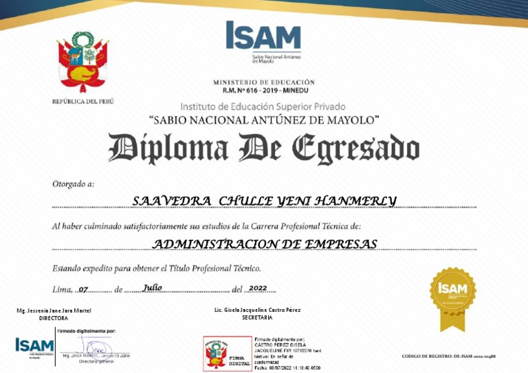 La carta fue escrita el 7 de julio de 2022 por la directora Mg. Jessenia Jane Jara Martel y la secretaria Lic. Gisela Jacqueline Castro Pérez de la carrera de Administración de Empresas para Saavedra Chulle Yeni Hanmerly sobre un código de registro DE-ISAM-2022-01488.