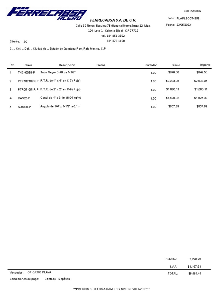 Vendedor: OF QROO PLAYA TOTAL: $8,464.44