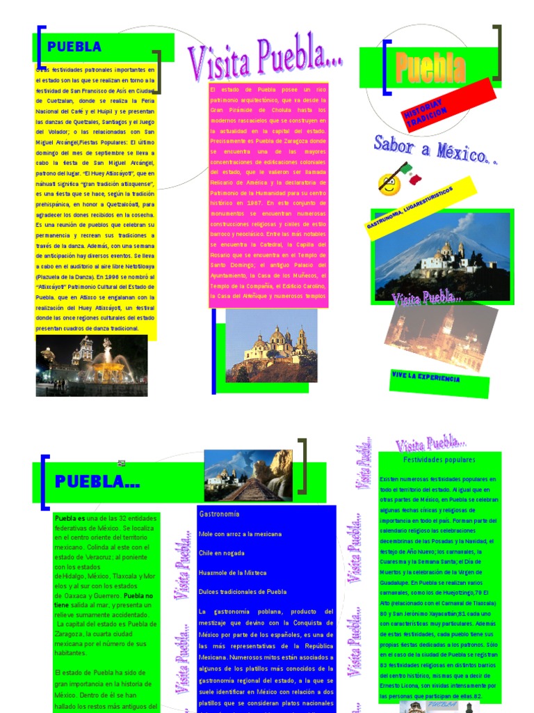 Otras festividades patronales importantes en el estado son las que se realizan en torno a la festividad de San Francisco de Ass en Ciudad de Cuetzalan, donde se realiza la Feria Nacional del Caf y el Huipil y se presentan las danzas de Quetzales, Santiagos y el Juego del Volador; o las relacionadas con San Miguel Arcngel,Fiestas Populares: El ltimo domingo del mes de septiembre se lleva a cabo la fiesta de San Miguel Arcngel, patrono del lugar. El Huey Atlixcyotl, que en nhuatl significa gran tradicin atlixquense, es una fiesta que se hace, segn la tradicin prehispnica, en honor a Quetzalcatl, para agradecer los dones recibidos en la cosecha. Es una reunin de pueblos que celebran su permanencia y recrean sus tradiciones a travs de la danza. Adems, con una semana de anticipacin hay diversos eventos. Se lleva a cabo en el auditorio al aire libre Netotiloaya (Plazuela de la Danza). En 1996 se nombr al Atlixcyotl Patrimonio Cultural del Estado de Puebla. que en Atlixco se engalanan con la realizacin del Huey Atlixcyotl, un festival donde las once regiones culturales del estado presentan cuadros de danza tradicional. El estado de Puebla de posee un hasta rico los patrimonio arquitectnico, que va desde la Gran Pirmide Cholula modernos rascacielos que se construyen en la actualidad en la capital del estado. Precisamente es Puebla de Zaragoza donde se encuentra una de las mayores concentraciones de edificaciones coloniales del estado, que le valieron ser llamada Relicario de Amrica y la declaratoria de Patrimonio de la Humanidad para su centro histrico en 1987. En este conjunto de monumentos se encuentran numerosas construcciones religiosas y civiles de estilo barroco y neoclsico. Entre las ms notables se encuentra la Catedral, la Capilla del Rosario que se encuentra en el Templo de Santo Domingo; el antiguo Palacio del Ayuntamiento, la Casa de los Muecos, el Templo de la Compaa, el Edificio Carolino, la Casa del Alfeique y numerosos templos