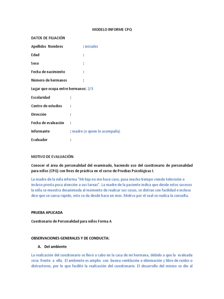 para niños (CPQ) con fines de práctica en el curso de Pruebas Psicológicas I.