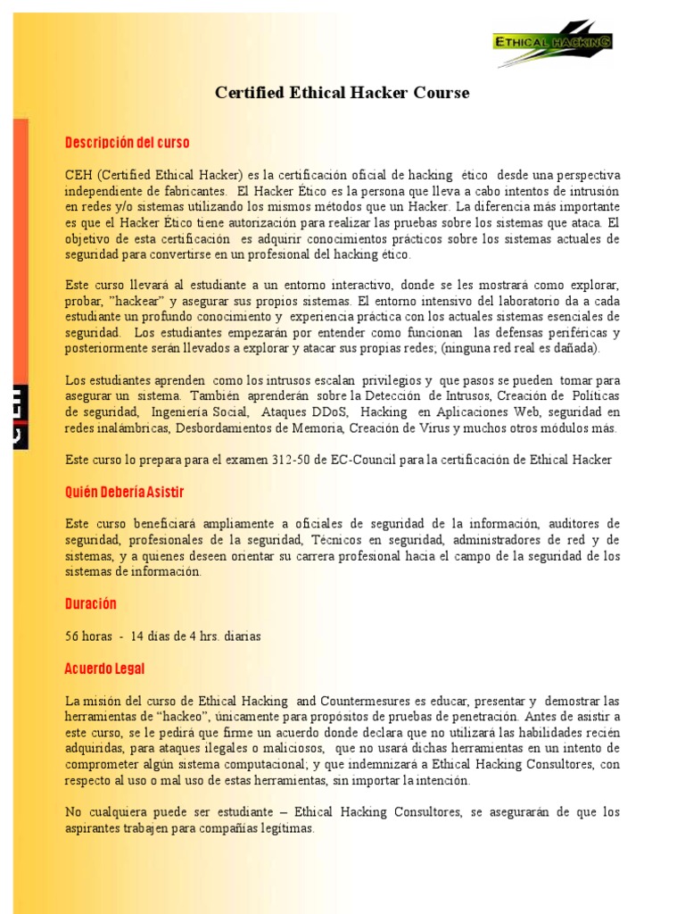 Descripcin del curso CEH (Certified Ethical Hacker) es la certificacin oficial de hacking tico desde una perspectiva independiente de fabricantes. El Hacker tico es la persona que lleva a cabo intentos de intrusin en redes y/o sistemas utilizando los mismos mtodos que un Hacker. La diferencia ms importante es que el Hacker tico tiene autorizacin para realizar las pruebas sobre los sistemas que ataca. El objetivo de esta certificacin es adquirir conocimientos prcticos sobre los sistemas actuales de seguridad para convertirse en un profesional del hacking tico. Este curso llevar al estudiante a un entorno interactivo, donde se les mostrar como explorar, probar, hackear y asegurar sus propios sistemas. El entorno intensivo del laboratorio da a cada estudiante un profundo conocimiento y experiencia prctica con los actuales sistemas esenciales de seguridad. Los estudiantes empezarn por entender como funcionan las defensas perifricas y posteriormente sern llevados a explorar y atacar sus propias redes; (ninguna red real es daada). Los estudiantes aprenden como los intrusos escalan privilegios y que pasos se pueden tomar para asegurar un sistema. Tambin aprendern sobre la Deteccin de Intrusos, Creacin de Polticas de seguridad, Ingeniera Social, Ataques DDoS, Hacking en Aplicaciones Web, seguridad en redes inalmbricas, Desbordamientos de Memoria, Creacin de Virus y muchos otros mdulos ms. Este curso lo prepara para el examen 312-50 de EC-Council para la certificacin de Ethical Hacker Quin Debera Asistir Este curso beneficiar ampliamente a oficiales de seguridad de la informacin, auditores de seguridad, profesionales de la seguridad, Tcnicos en seguridad, administradores de red y de sistemas, y a quienes deseen orientar su carrera profesional hacia el campo de la seguridad de los sistemas de informacin. Duracin 56 horas - 14 das de 4 hrs. diarias Acuerdo Legal La misin del curso de Ethical Hacking and Countermesures es educar, presentar y demostrar las herramientas de hackeo, nicamente para propsitos de pruebas de penetracin. Antes de asistir a este curso, se le pedir que firme un acuerdo donde declara que no utilizar las habilidades recin adquiridas, para ataques ilegales o maliciosos, que no usar dichas herramientas en un intento de comprometer algn sistema computacional; y que indemnizar a Ethical Hacking Consultores, con respecto al uso o mal uso de estas herramientas, sin importar la intencin. No cualquiera puede ser estudiante Ethical Hacking Consultores, se asegurarn de que los aspirantes trabajen para compaas legtimas.