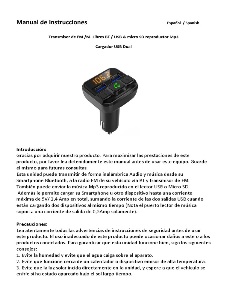 Transmisor de FM /M. Libres BT / USB & micro SD reproductor Mp3