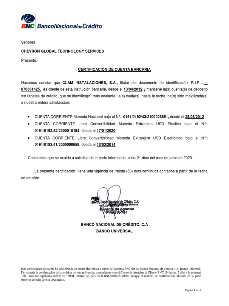 Esta certificación de cuenta ha sido emitida en forma electrónica a través del Sistema BNCNet del Banco Nacional de Crédito C.A. Banco Universal.