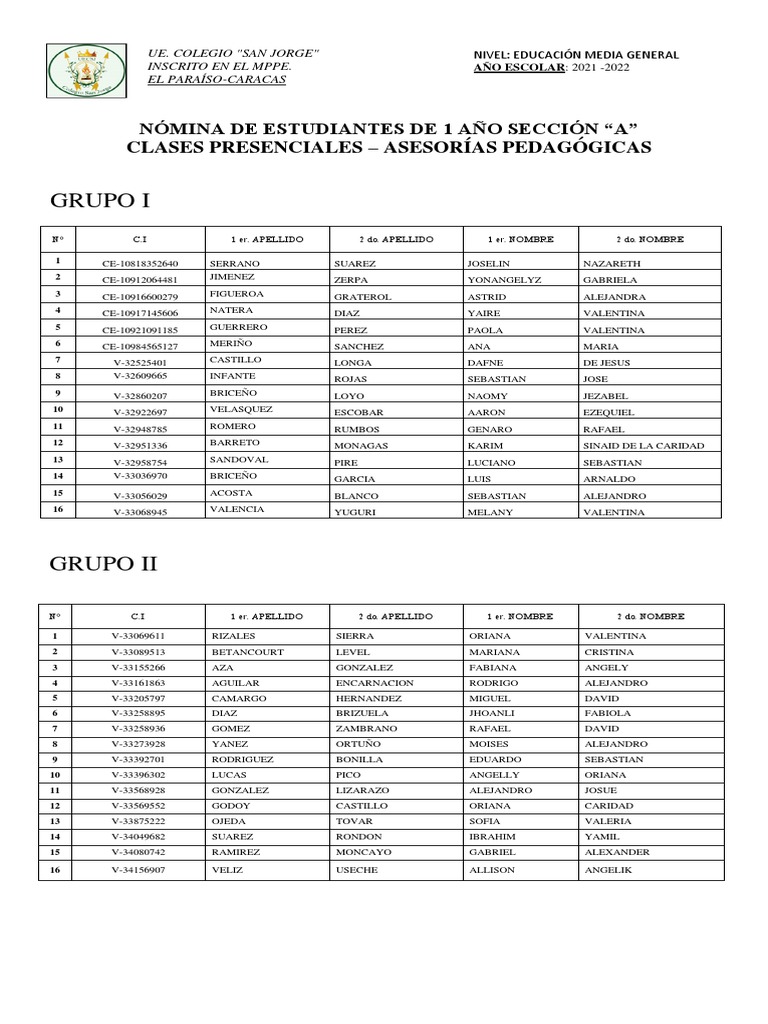 NÓMINA DE ESTUDIANTES DE 1 AÑO SECCIÓN “A”