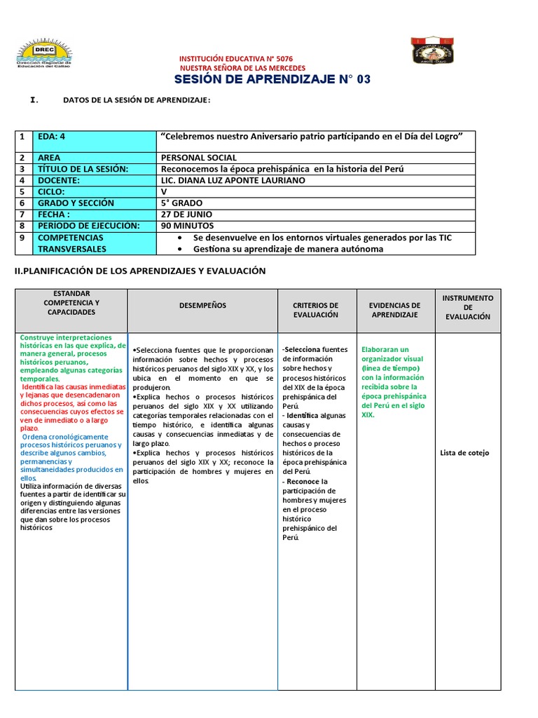 I. DATOS DE LA SESIÓN DE APRENDIZAJE: