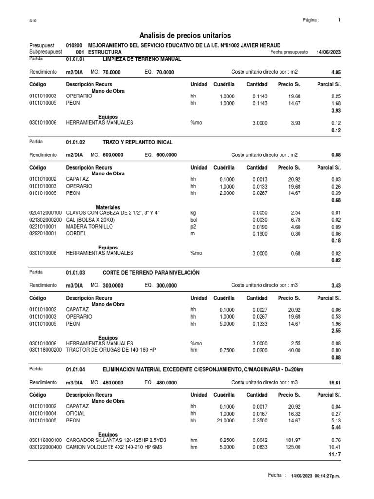 Código Descripción Recurs Unidad Cuadrilla Cantidad Precio S/. Parcial S/.