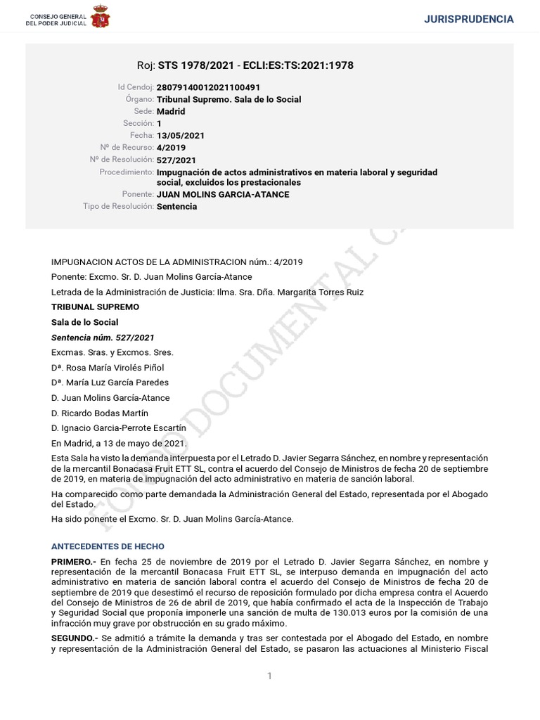 y carece de objetividad; se explica el objeto social de la empresa Bonacasa Fruit ETT SL, así como la figura