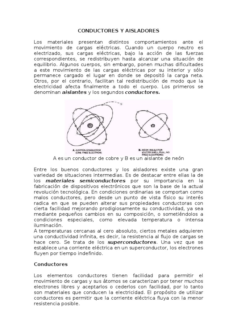 A es un conductor de cobre y B es un aislante de nen Entre los buenos conductores y los aisladores existe una gran variedad de situaciones intermedias. Es de destacar entre ellas la de los materiales semiconductores por su importancia en la fabricacin de dispositivos electrnicos que son la base de la actual revolucin tecnolgica. En condiciones ordinarias se comportan como malos conductores, pero desde un punto de vista fsico su inters radica en que se pueden alterar sus propiedades conductoras con cierta facilidad mejorando prodigiosamente su conductividad, ya sea mediante pequeos cambios en su composicin, o sometindolos a condiciones especiales, como elevada temperatura o intensa iluminacin. A temperaturas cercanas al cero absoluto, ciertos metales adquieren una conductividad infinita, es decir, la resistencia al flujo de cargas se hace cero. Se trata de los superconductores. Una vez que se establece una corriente elctrica en un superconductor, los electrones fluyen por tiempo indefinido. Conductores Los elementos conductores tienen facilidad para permitir el movimiento de cargas y sus tomos se caracterizan por tener muchos electrones libres y aceptarlos o cederlos con facilidad, por lo tanto son materiales que conducen la electricidad. El propsito de utilizar conductores es permitir que la corriente elctrica fluya con la menor resistencia posible.