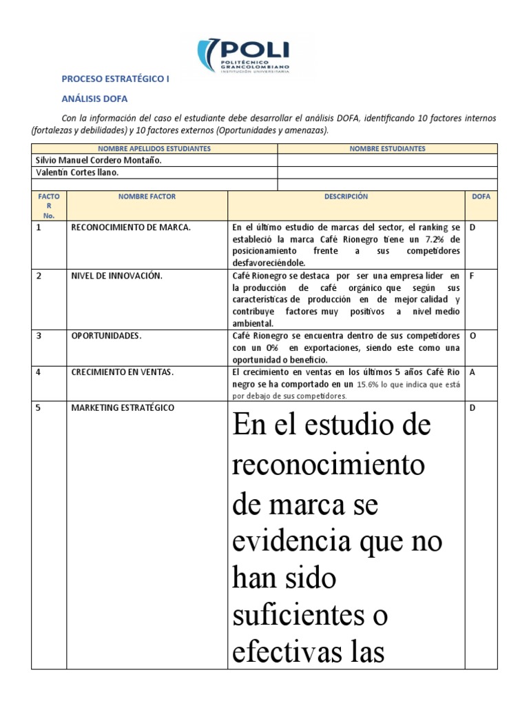 Con la información del caso el estudiante debe desarrollar el análisis DOFA, identificando 10 factores internos