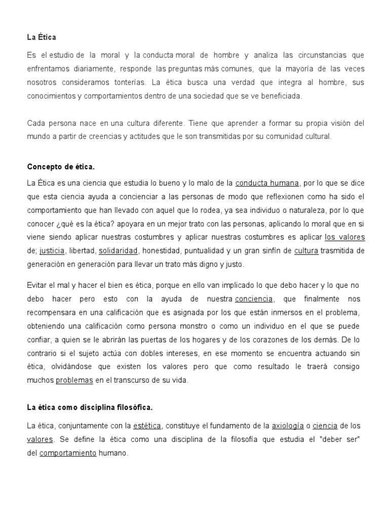 valores . Se define la ética como una disciplina de la filosofía que estudia el "deber ser"