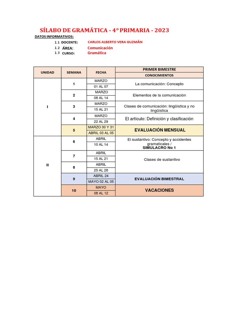 SÍLABO DE GRAMÁTICA - 4° PRIMARIA - 2023