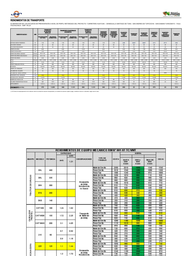RENDIMIENTOS DE EQUIPO MECANICO RM Nº 001-87-TC/VMT