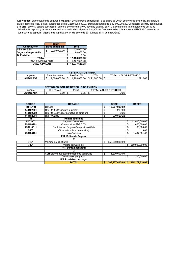 para el ramo de robo, el valor asegurado es de $ 250´000.000,00, prima asegurada de $ 12´000.000.00. Considerar el 3.5% contribución