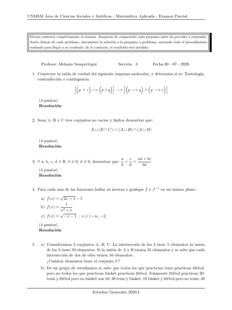 UNMSM Área de Ciencias Sociales y Jurı́dicas - Matemática Aplicada - Examen Parcial