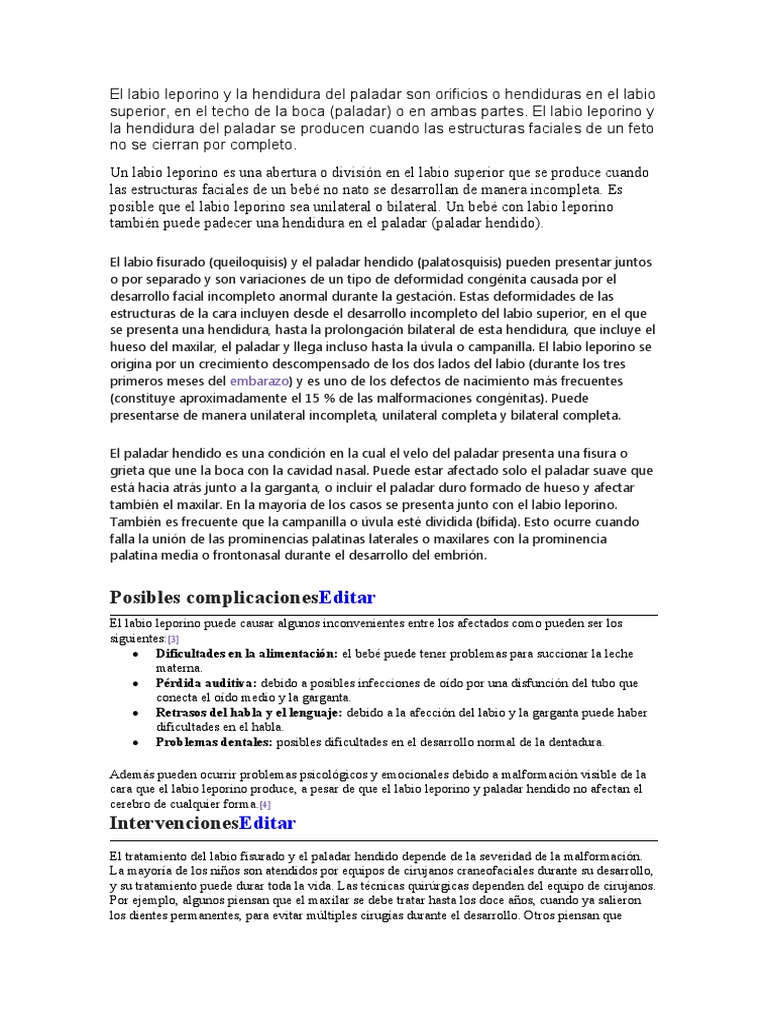 superior, en el techo de la boca (paladar) o en ambas partes. El labio leporino y