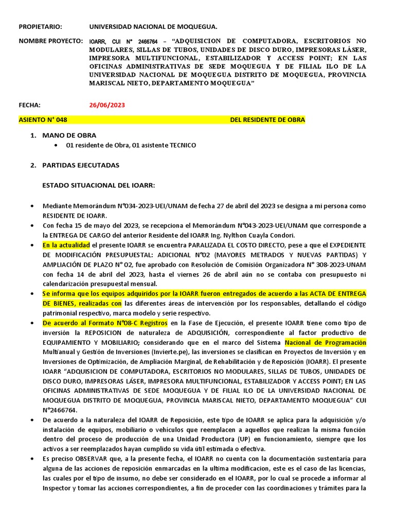 ASIENTO N° 048 DEL RESIDENTE DE OBRA