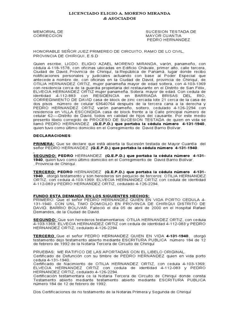 presento libelo corregido de PROCESO DE SUCESION TESTADA de quien en vida se