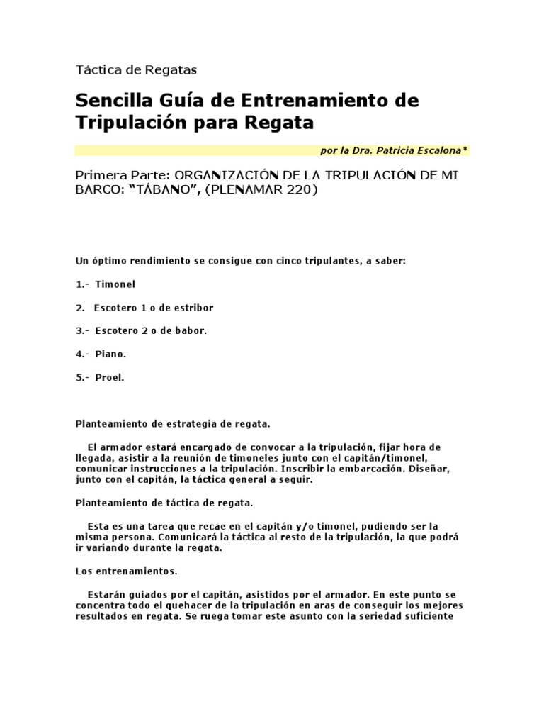 GENERALIDADES: El entrenamiento: 1.- Cada tripulante se identificar con la funcin que ms le agrade o para la cual tenga ms condiciones dada su estatura, complexin fsica, conocimientos, requerimientos del barco, etc. 2.- No obstante lo anterior, el capitn podr solicitarle su accin en cualquier otro puesto de la tripulacin. 3.- La asistencia a los entrenamientos deber estimarse como un llamado formal a regata, por lo cual se solicita compromiso con el programa. En caso de no poder asistir, se le comunicar con anticipacin al capitn, de ser posible, con 48 horas de anticipacin.