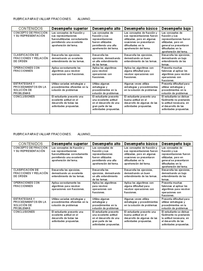 RUBRICA PARA EVALUAR FRACCIONES. ALUMNO_______________________________________________________