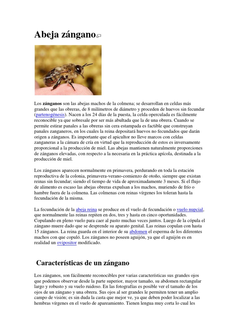 Los znganos son las abejas machos de la colmena; se desarrollan en celdas ms grandes que las obreras, de 8 milmetros de dimetro y proceden de huevos sin fecundar (partenognesis). Nacen a los 24 das de la puesta, la celda operculada es fcilmente reconocible ya que sobresale por ser ms abultada que la de una obrera. Cuando se permite estirar panales a las obreras sin cera estampada es factible que construyan panales zanganeros, en los cuales la reina depositar huevos no fecundados que darn origen a znganos. Es importante que el apicultor no lleve marcos con celdas zanganeras a la cmara de cra en virtud que la reproduccin de estos es inversamente proporcional a la produccin de miel. Las abejas mantienen naturalmente proporciones de znganos elevadas, con respecto a la necesaria en la prctica apcola, destinada a la produccin de miel. Los znganos aparecen normalmente en primavera, perdurando en toda la estacin reproductiva de la colonia, primavera-verano-comienzo de otoo, siempre que existan reinas sin fecundar; siendo el tiempo de vida de aproximadamente 3 meses. Si el flujo de alimento es escaso las abejas obreras expulsan a los machos, muriendo de fro o hambre fuera de la colmena. Las colmenas con reinas vrgenes los toleran hasta la fecundacin de la misma. La fecundacin de la abeja reina se produce en el vuelo de fecundacin o vuelo nupcial, que normalmente las reinas repiten en dos, tres y hasta en cinco oportunidades. Copulando en pleno vuelo para caer al pasto muchas veces juntos. Luego de la cpula el zngano muere dado que se desprende su aparato genital. Las reinas copulan con hasta 15 znganos. La reina guarda en el interior de su abdomen el esperma de los diferentes machos con que copul. Los znganos no poseen aguijn, ya que el aguijn es en realidad un ovipositor modificado.