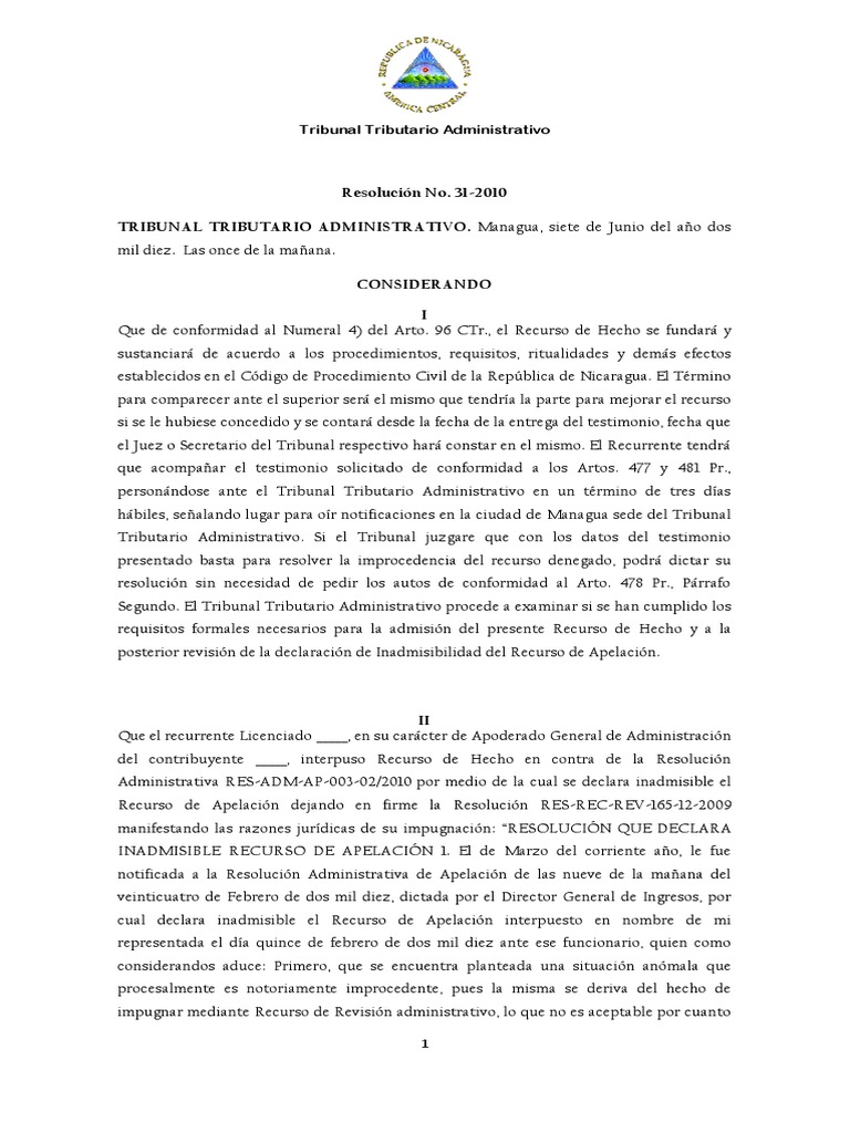 del contribuyente _____, interpuso Recurso de Hecho en contra de la Resolución