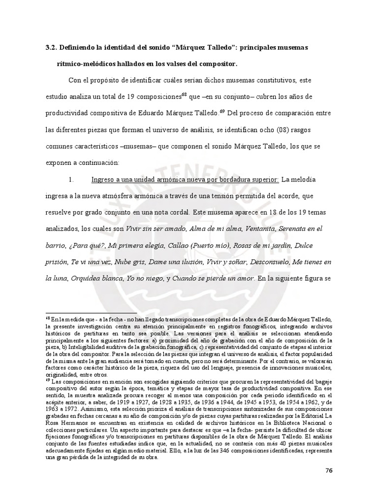 fijaciones fonográficas y/o transcripciones en partituras disponibles de la obra de Márquez Talledo. El análisis