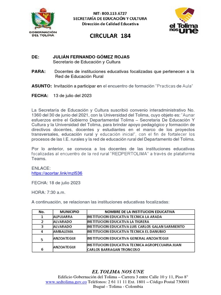 www.sedtolima.gov.co Teléfonos: 2 61 11 11 Ext. 1801 – Código Postal 730001