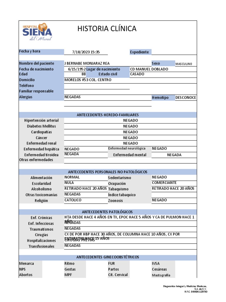 Nombre del paciente J BERNABE MONJARAZ REA Sexo MASCULINO