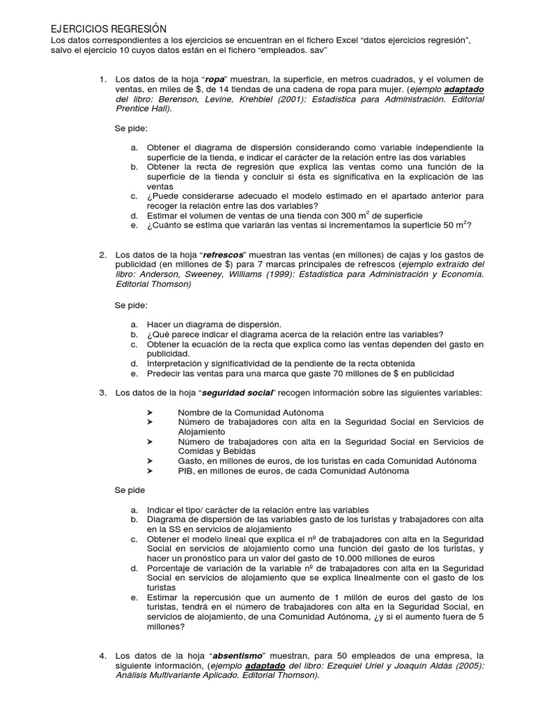 Los datos correspondientes a los ejercicios se encuentran en el fichero Excel “datos ejercicios regresión”,