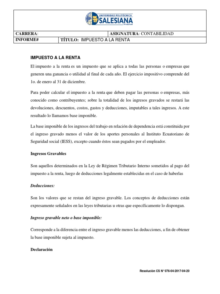 INFORME# TÍTULO: IMPUESTO A LA RENTA