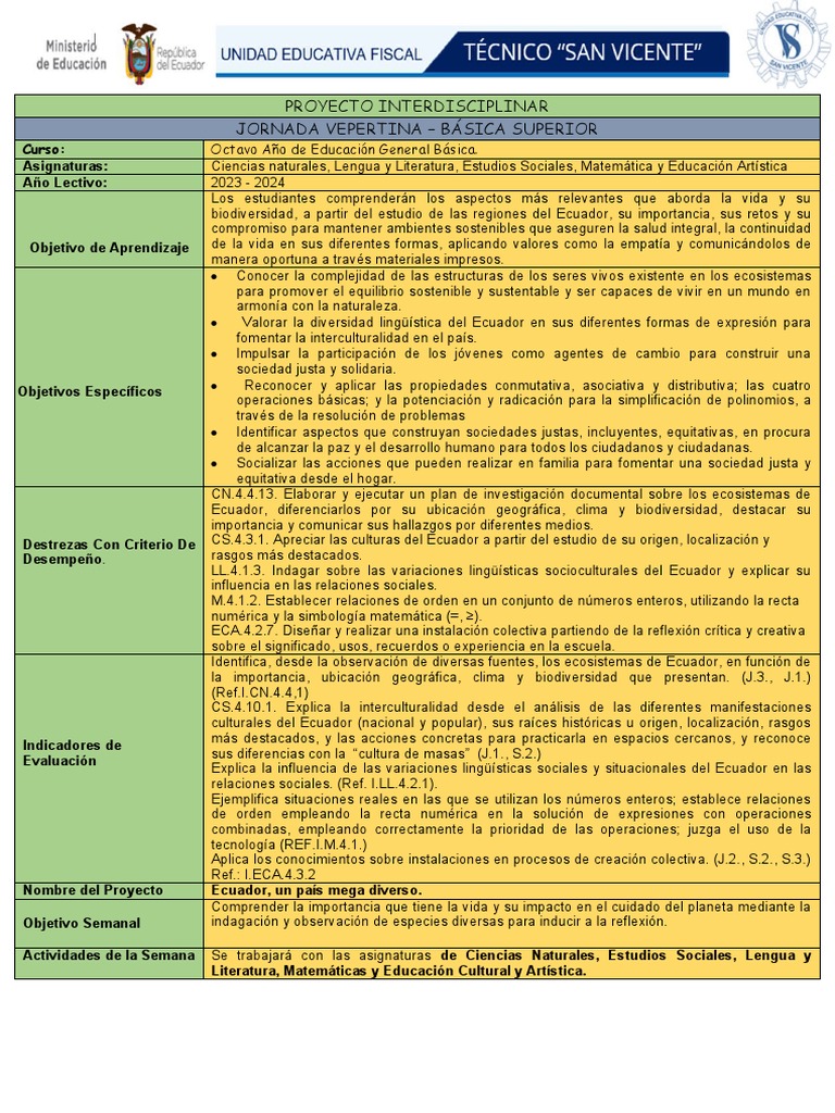 Asignaturas: Ciencias naturales, Lengua y Literatura, Estudios Sociales, Matemática y Educación Artística