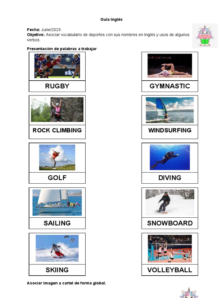 Objetivo: Asociar vocabulario de deportes con sus nombres en Inglés y usos de algunos