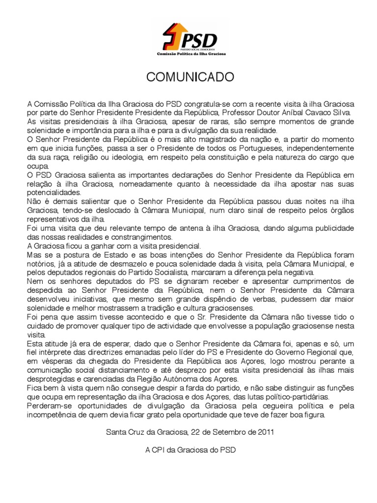 A Comisso Poltica da Ilha Graciosa do PSD congratula-se com a recente visita ilha Graciosa por parte do Senhor Presidente Presidente da Repblica, Professor Doutor Anbal Cavaco Silva. As visitas presidenciais ilha Graciosa, apesar de raras, so sempre momentos de grande solenidade e importncia para a ilha e para a divulgao da sua realidade. O Senhor Presidente da Repblica o mais alto magistrado da nao e, a partir do momento em que inicia funes, passa a ser o Presidente de todos os Portugueses, independentemente da sua raa, religio ou ideologia, em respeito pela constituio e pela natureza do cargo que ocupa. O PSD Graciosa salienta as importantes declaraes do Senhor Presidente da Repblica em relao ilha Graciosa, nomeadamente quanto necessidade da ilha apostar nas suas potencialidades. No demais salientar que o Senhor Presidente da Repblica passou duas noites na ilha Graciosa, tendo-se deslocado Cmara Municipal, num claro sinal de respeito pelos rgos representativos da ilha. Foi uma visita que deu relevante tempo de antena ilha Graciosa, dando alguma publicidade das nossas realidades e constrangimentos. A Graciosa cou a ganhar com a visita presidencial. Mas se a postura de Estado e as boas intenes do Senhor Presidente da Repblica foram notrios, j a atitude de desmazelo e pouca solenidade dada visita, pela Cmara Municipal, e pelos deputados regionais do Partido Socialista, marcaram a diferena pela negativa. Nem os senhores deputados do PS se dignaram receber e apresentar cumprimentos de despedida ao Senhor Presidente da Repblica, nem o Senhor Presidente da Cmara desenvolveu iniciativas, que mesmo sem grande dispndio de verbas, pudessem dar maior solenidade e melhor mostrassem a tradio e cultura graciosenses. Foi pena que assim tivesse acontecido e que o Sr. Presidente da Cmara no tivesse tido o cuidado de promover qualquer tipo de actividade que envolvesse a populao graciosense nesta visita. Esta atitude j era de esperar, dado que o Senhor Presidente da Cmara foi, apenas e s, um el intrprete das directrizes emanadas pelo lder do PS e Presidente do Governo Regional que, em vsperas da chegada do Presidente da Repblica aos Aores, logo mostrou perante a comunicao social distanciamento e at desprezo por esta visita presidencial s ilhas mais desprotegidas e carenciadas da Regio Autnoma dos Aores. Fica bem vista quem no consegue despir a farda do partido, e no sabe distinguir as funes que ocupa em representao da ilha Graciosa e dos Aores, das lutas poltico-partidrias. Perderam-se oportunidades de divulgao da Graciosa pela cegueira poltica e pela incompetncia de quem devia car grato pela oportunidade que teve de fazer boa gura. Santa Cruz da Graciosa, 22 de Setembro de 2011 A CPI da Graciosa do PSD